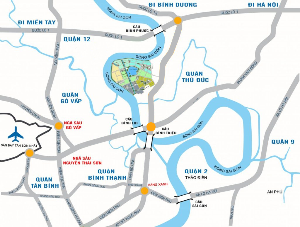 Tọa lạc mặt tiền Quốc lộ 13, 3 mặt giáp sông Sài Gòn, cách cầu Bình Triêu chỉ 1km, Van Phuc City được đánh giá là trọng điểm kinh tế chiến lược của Q.Thủ Đức. Nếu lấy trọng tâm và quay compa trong bán kính 6km, khu đô thị Vạn Phúc sẽ kết nối thông suốt với các vùng kinh tế trọng điểm lân cận bằng Quốc lộ 1A, hay Phạm Văn Đồng chỉ với 5 – 7 phút di chuyển.